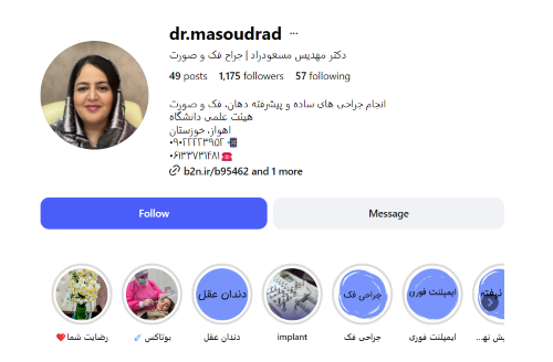 جراح فک و صورت و متخصص ایمپلنتدکتر مهدیس مسعودراد از متخصصین جراحی فک و صورت و ایمپلنت میباشد. وی تحصیلات خود را در دانشگاه علوم پزشکی جندی شاپور اهواز گذرانده و به عنوان بهترین متخصص ایمپلنت شناخته میشود که دارای بیش از 10 سال سابقه کاری است. ایشان مسئول پژوهش گروه جراحی فک و صورت اهواز بوده و عضو هیئت علمی دانشگاه جندی شاپور میباشد.