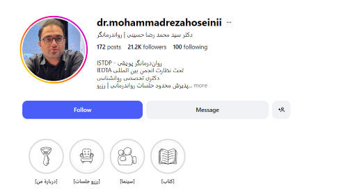 دکتر سید محمدرضا حسینی به عنوان روان درمانگر در اهواز فعالیت میکند. ایشان عضو انجمن روانشناسی آمریکا، عضو سازمان نظام روانشناسی و مشاوره ایران و عضو انستیتو طرحواره درمانی ایران است. وی از مدرک دکترای تخصصی روانشناسی و کارشناس ارشد روانشناسی بالینی برخوردار میباشد و دارای بیش از 6 سال سابقه کاری دارد.